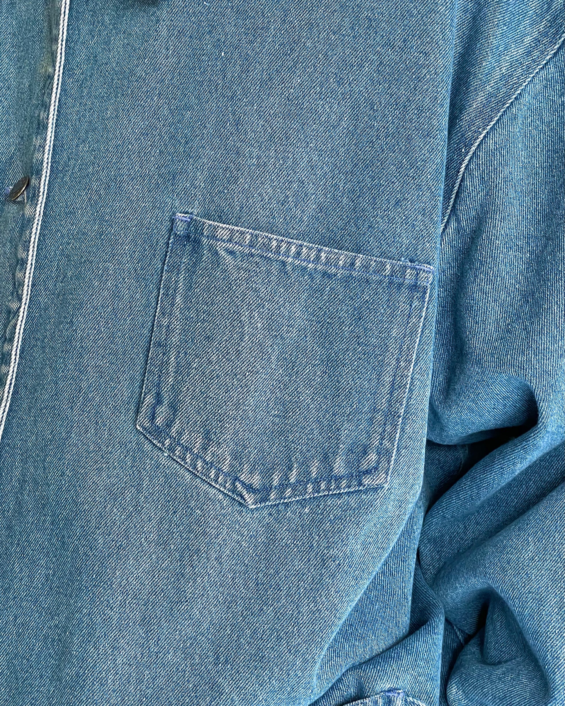 柔らかいデニム生地で仕上げたオーバーサイズのカバーオールジャケット。3Xのボリューム感が、ハーフコートのような存在感を作る一枚です。軽い羽織としても、季節を問わず、使えるデニムアウター。