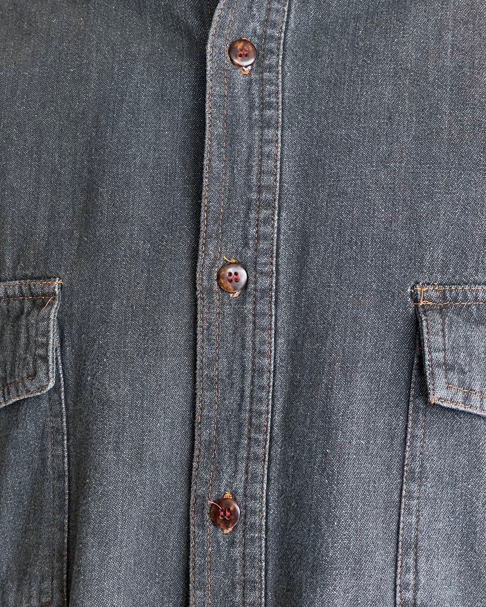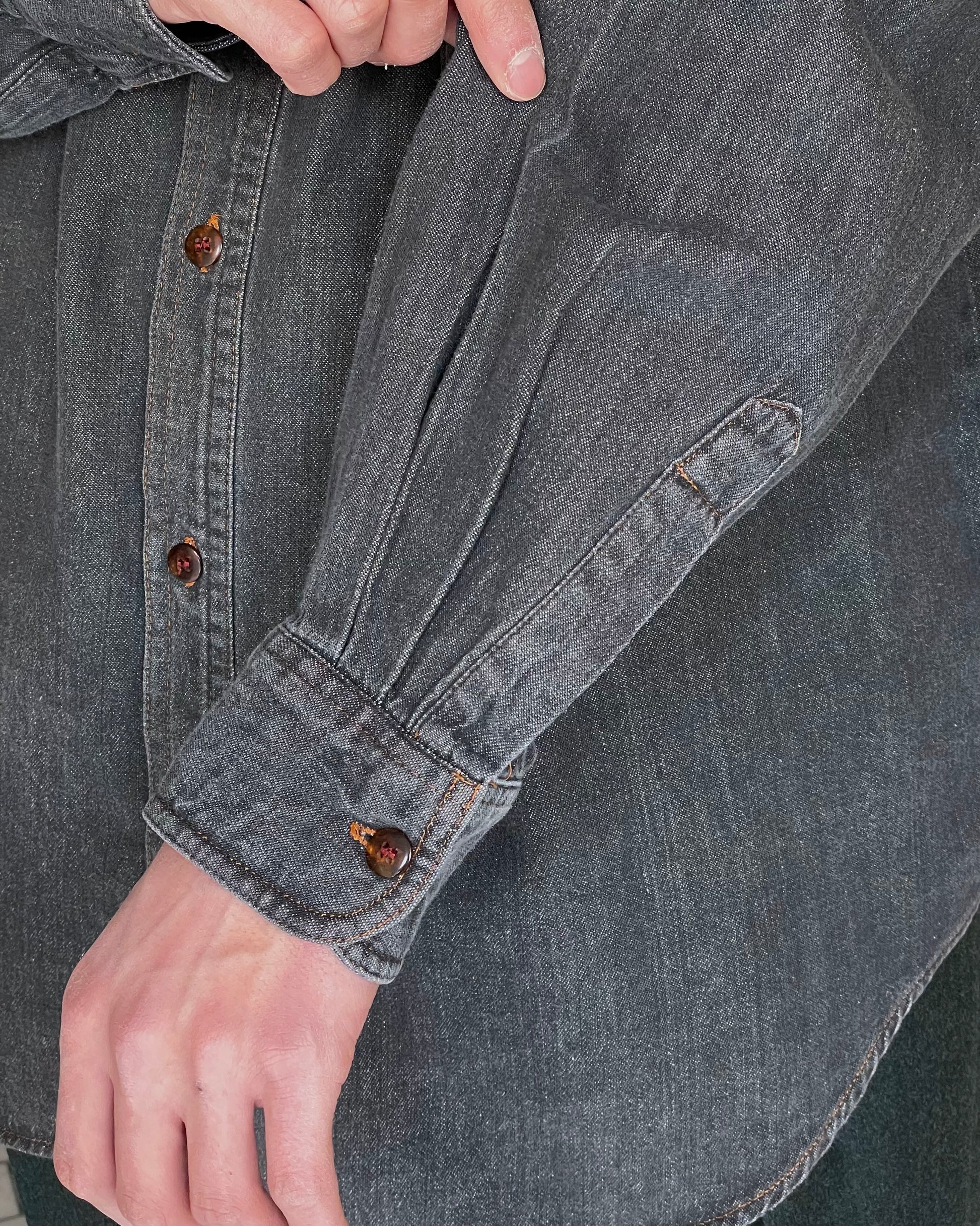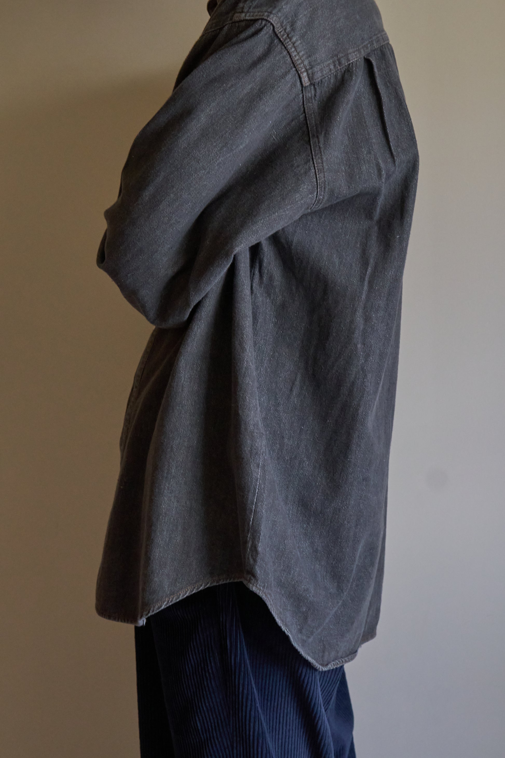 無骨なフェードブラックカラーのデニムシャツ。